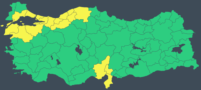 Öte yandan, İstanbul ile birlikte Adana, Balıkesir, Bolu, Bursa, Çanakkale, Hatay, Kastamonu, Kocaeli, Sakarya, Tekirdağ, Zonguldak, Bartın, Yalova, Karabük, Osmaniye ve Düzce için "sarı" kodlu uyarıda bulunuldu.