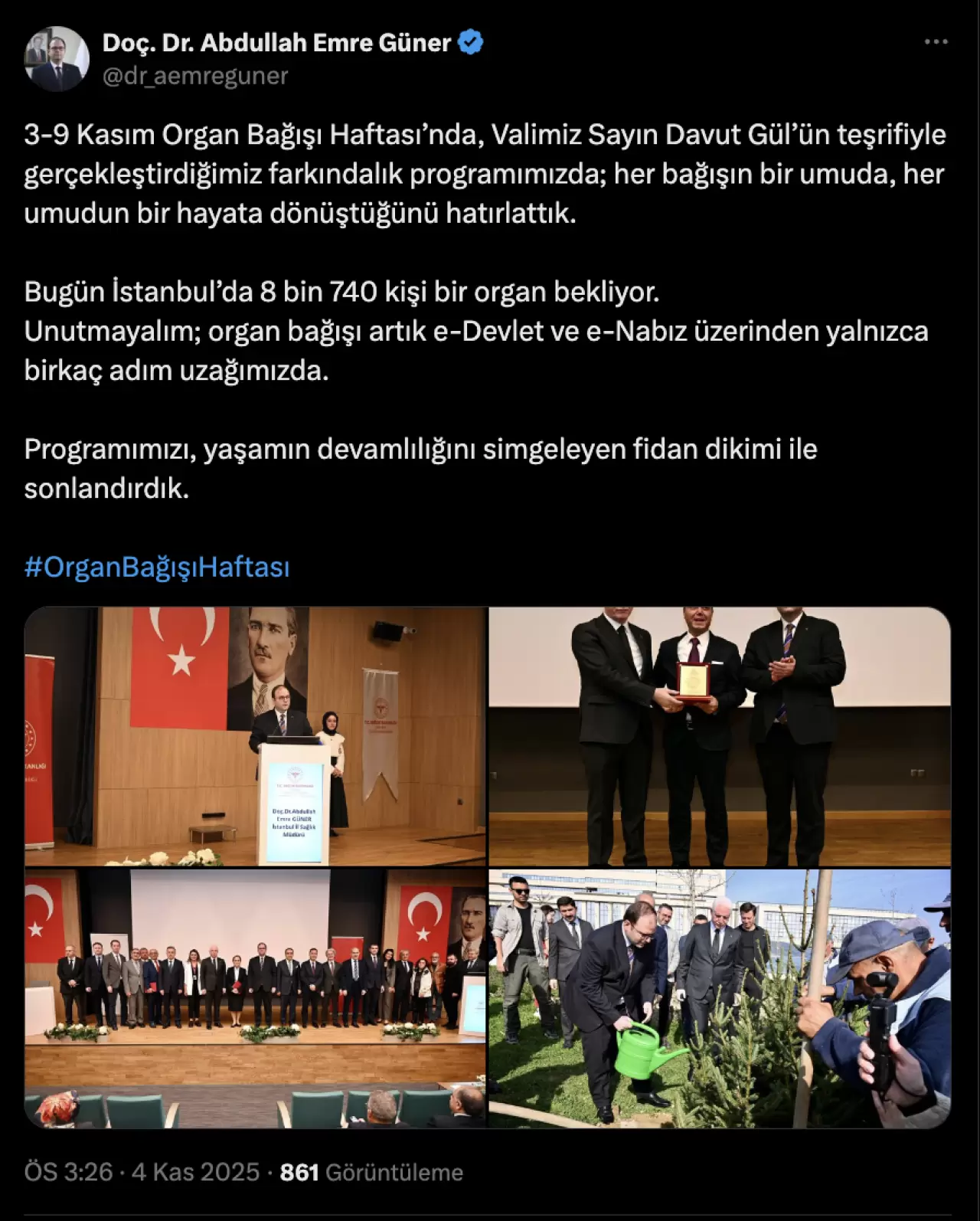 Güner, organ bağışının artık çok daha kolay hale geldiğini vurgulayarak, “Organ bağışı artık e-Devlet ve e-Nabız üzerinden yalnızca birkaç adım uzağımızda. Programımızı, yaşamın devamlılığını simgeleyen fidan dikimi ile sonlandırdık.” ifadelerini kullandı.