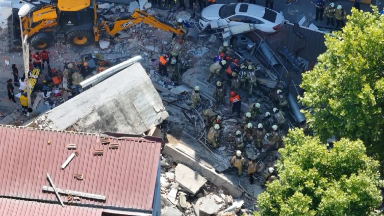 Öte yandan, çöken bina park halindeki araçların üzerine yıkılırken, yoldan geçen belediye otobüsünde de hasar oluştu.
