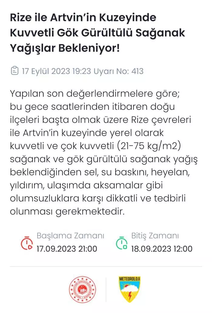 KUVVETLİ YAĞIŞ UYARISI: Yağışların; Rize çevreleri ile Artvin'in kuzey ilçelerinde yerel kuvvetli olması beklendiğinden yaşanabilecek olumsuzluklara karşı vatandaşların ve ilgililerin dikkatli ve tedbirli olmaları gerekmektedir.