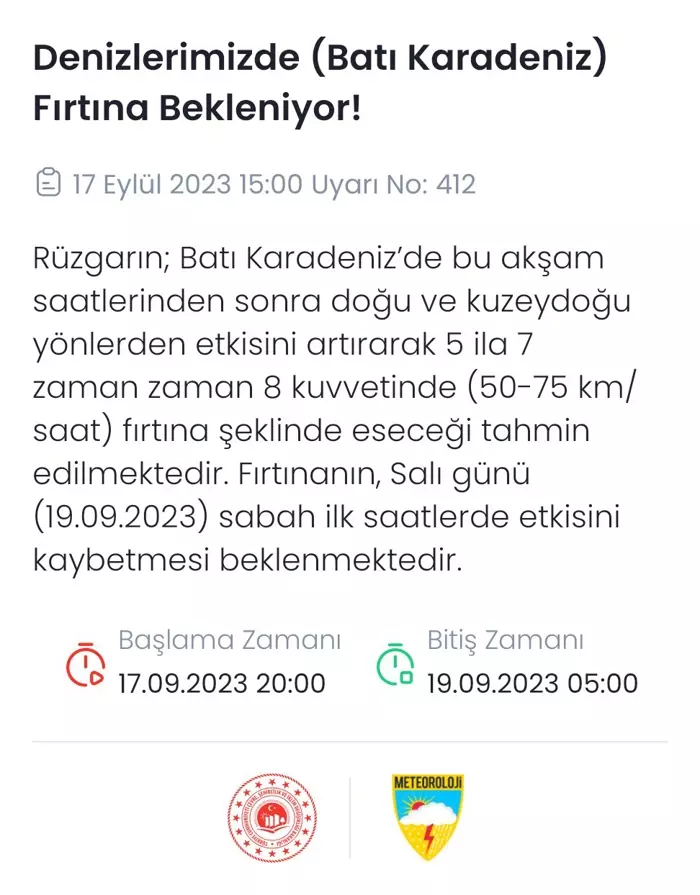Batı Karadeniz'de rüzgarın bu akşam saatlerinden sonra doğu ve kuzeydoğu yönlerden etkisini artırarak fırtına şeklinde eseceği tahmin ediliyor. Fırtınanın, Salı günü sabah ilk saatlerde etkisini kaybetmesi bekleniyor.