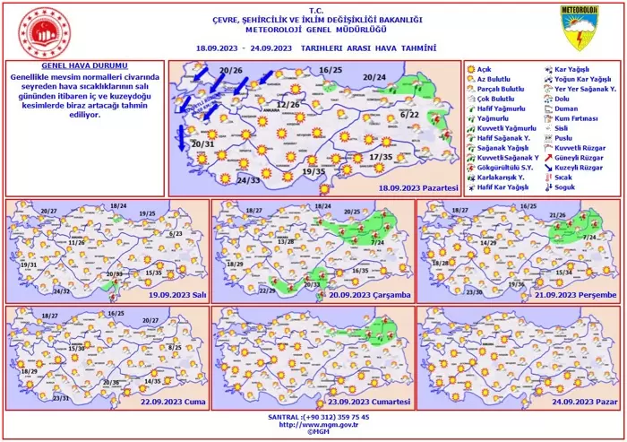 Meteoroloji Genel Müdürlüğü 18 Eylül hava durumu raporunu paylaştı. Rapora göre; Rize, Artvin, Ardahan, Kars, Van, Ağrı'da kuvvetli yağış beklenirken, hava sıcaklıklarında ise önemli bir değişiklik olmayacağı, yurdun batı ve güney kesimlerinde mevsim normallerinin 2-4 derece üzerinde, diğer yerlerde mevsim normalleri civarında seyredeceği tahmin ediliyor.