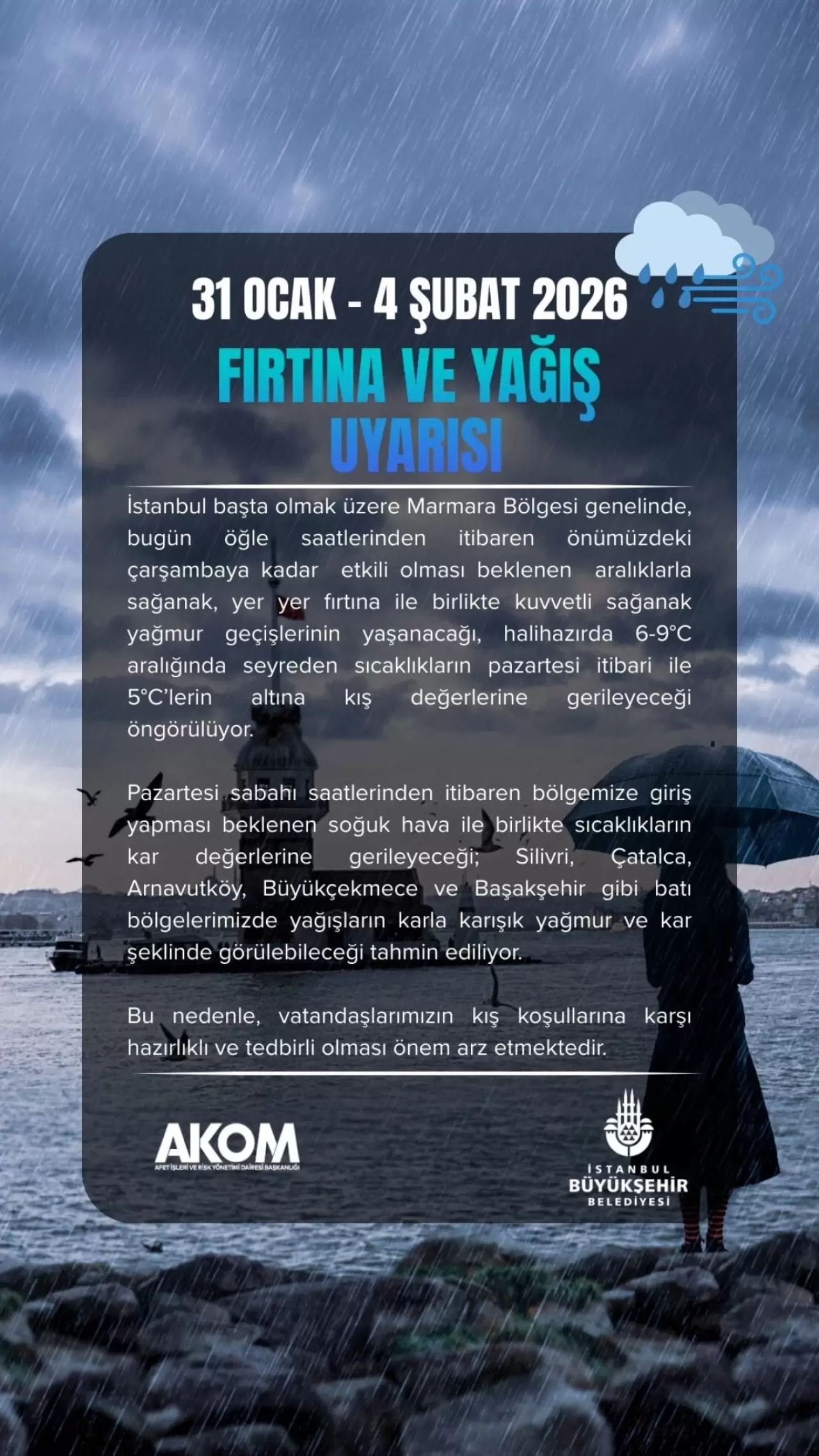 İstanbul Büyükşehir Belediyesi Afet Koordinasyon Merkezi (AKOM) tarafından yapılan açıklamada, İstanbul başta olmak üzere Marmara Bölgesi genelinde 4 Şubat Çarşamba gününe kadar aralıklarla sağanak yağışların görüleceği, yer yer fırtına eşliğinde kuvvetli yağış geçişlerinin yaşanmasının beklendiği belirtildi.