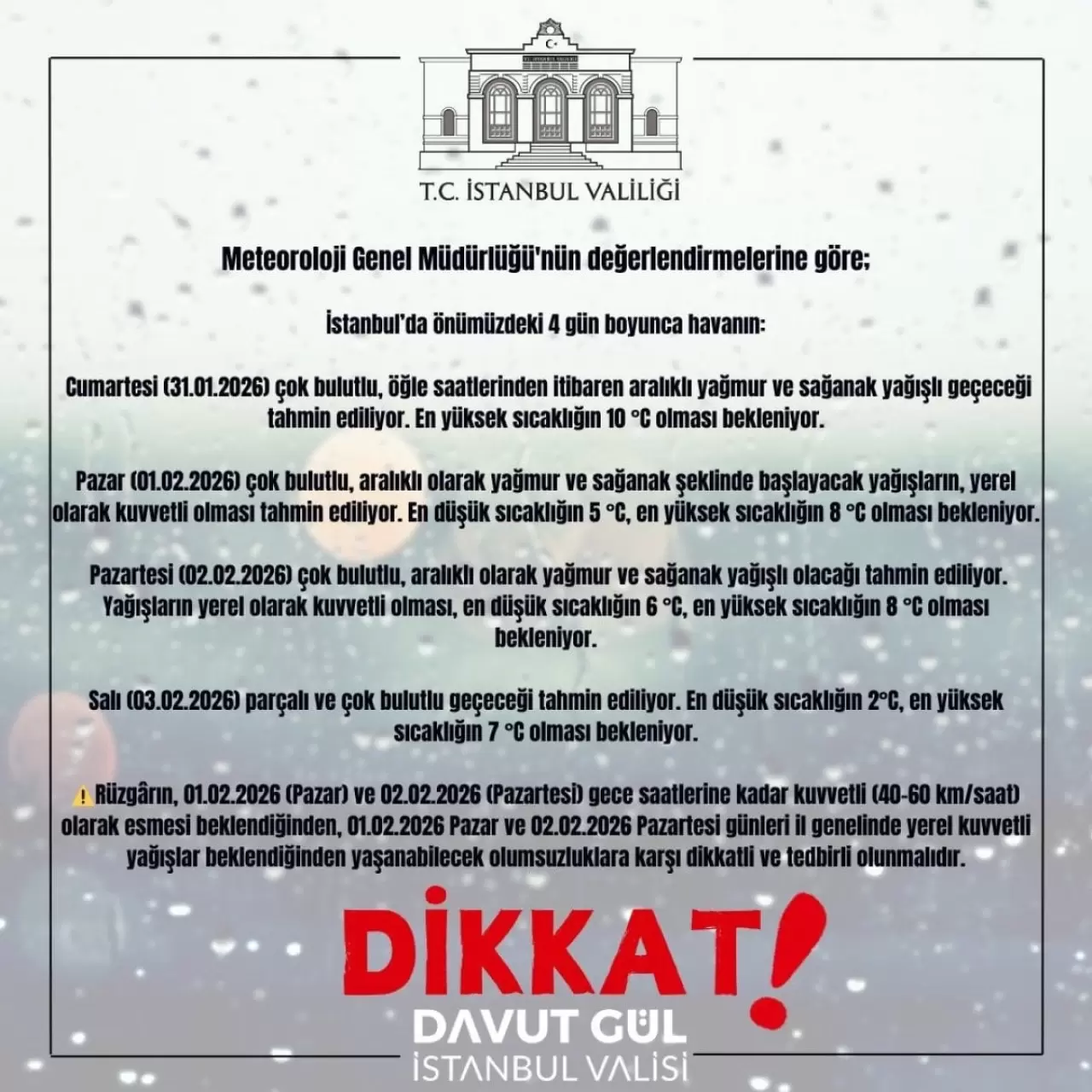 İstanbul Valiliği'nden yapılan açıklamada Meteoroloji Genel Müdürlüğü'nün yaptığı son değerlendirmelere göre pazar gününden itibaren çok bulutlu, aralıklarla yağmur ve sağanak yağışların yerel olarak kuvvetli, en düşük sıcaklığın 5, en yüksek sıcaklığın 8 derece olmasının beklendiği kaydedildi.