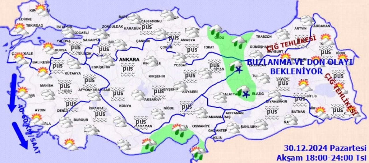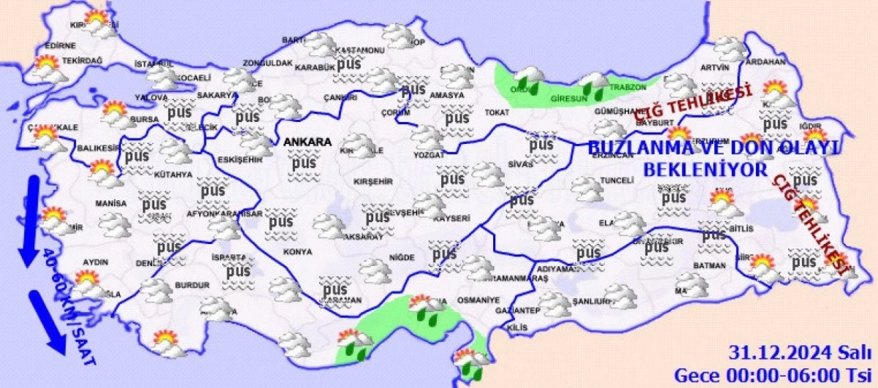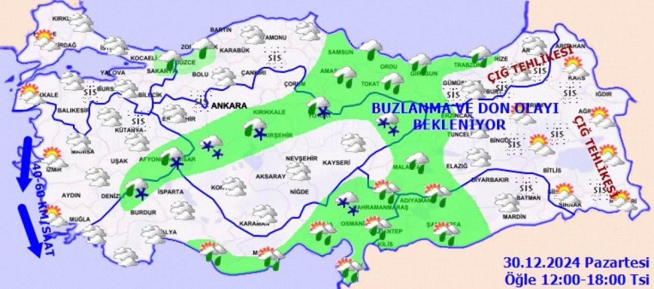 Yağışların Doğu Akdeniz ile Adıyaman, Gaziantep ve Kilis çevrelerinde yer yer kuvvetli olacağı tahmin ediliyor. Yurdun iç ve doğu kesimlerinde buzlanma ve don ile birlikte pus ve sis bekleniyor. Doğu Karadeniz’in iç kesimlerinin yüksekleri ile Doğu Anadolu’nun doğusunun yüksek ve dik yamaçlarında çığ tehlikesi bulunmakta.