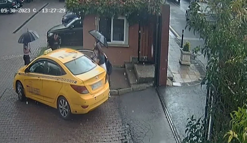 Taksiyle kaldırıma çıkarak durabilen şoför daha sonra aracından inerek taksiyi kontrol etti. Güvenlik kulübesinden çıkan İ.Ö ise taksiye bindi.