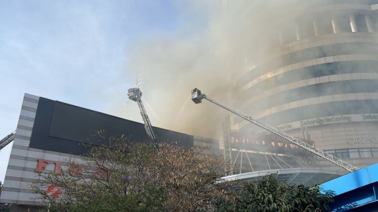 Alışveriş merkezinin çatısında çıkan yangının söndürülmesi için ekiplerin müdahalesi sürüyor.