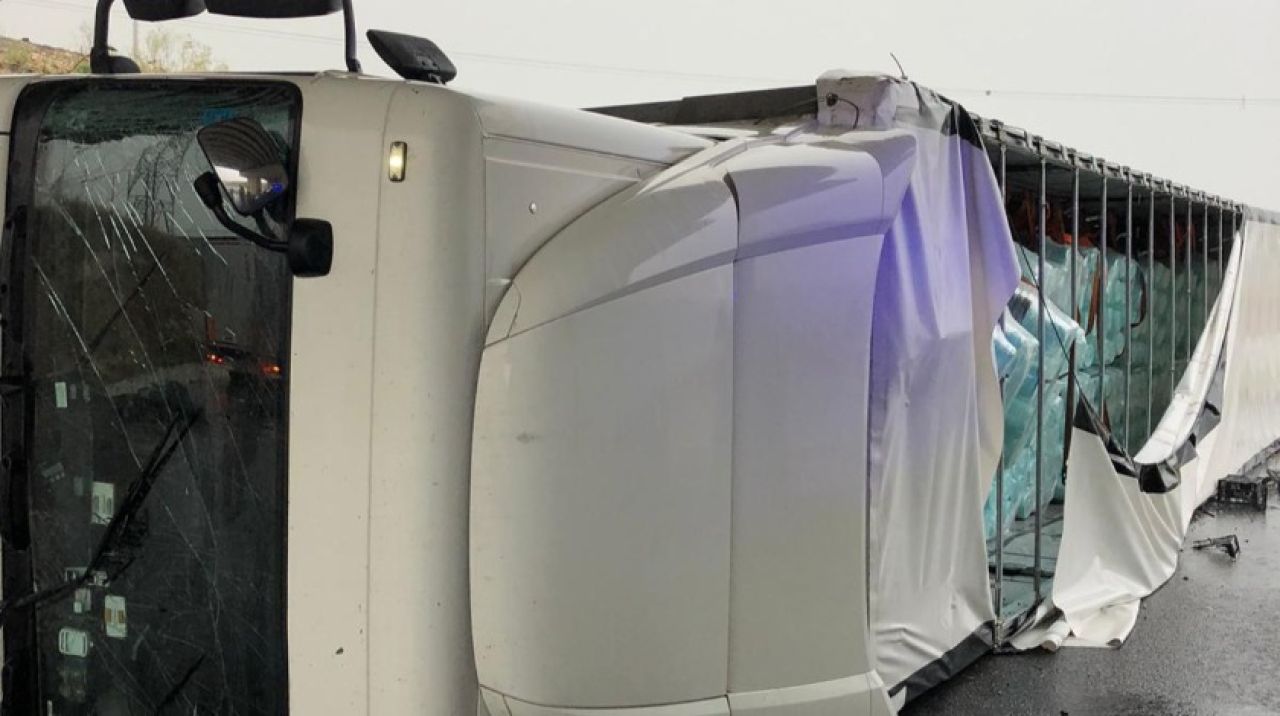 İstanbul'u etkisi altına alan fırtına sebebiyle Çatalca Muratbey Gümrük Müdürlüğü'nde hortumun etkisiyle seyir halindeki TIR devrildi.