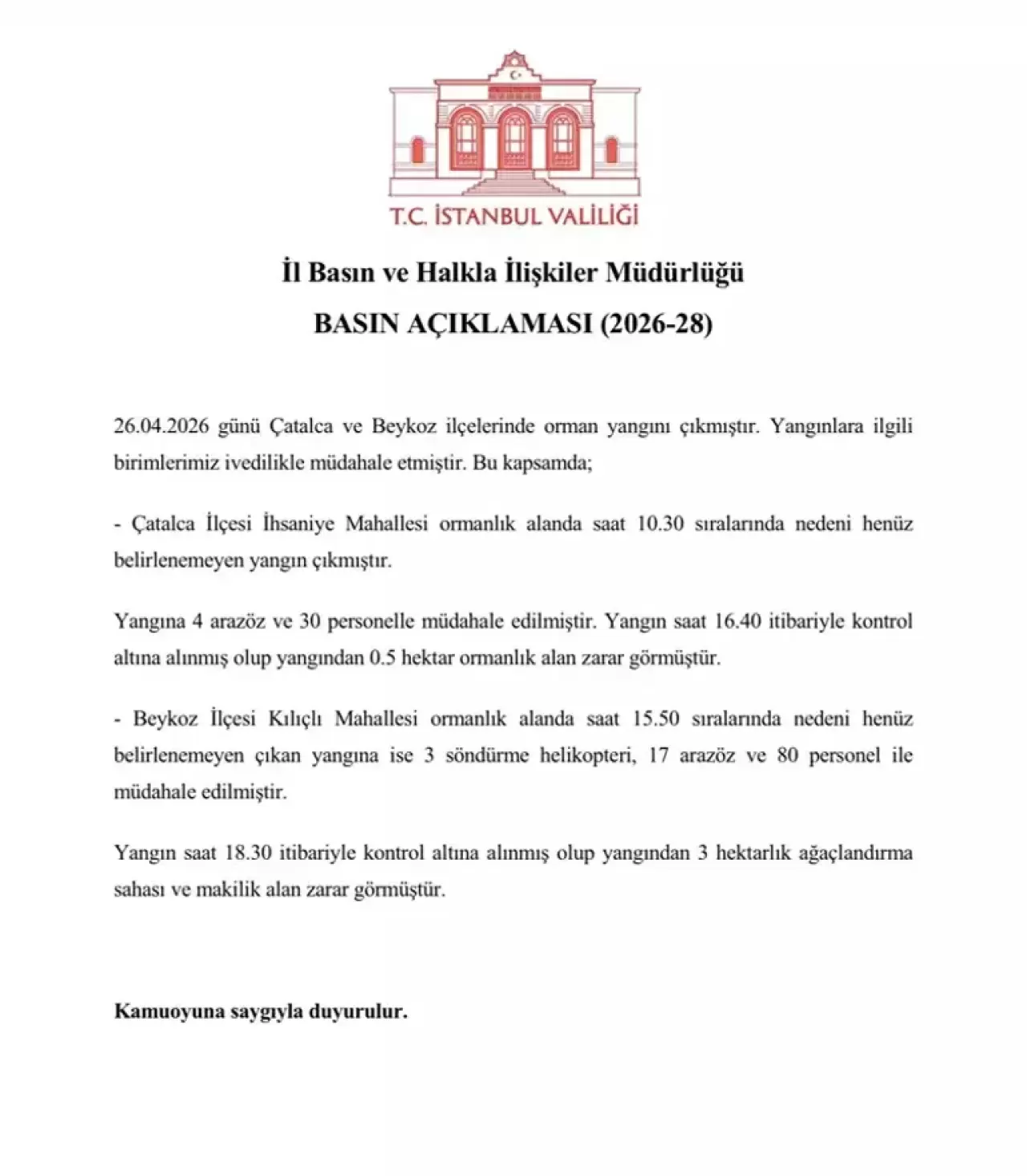 Beykoz Kılıçlı Mahallesi’nde ise saat 15.50’de başlayan yangına 3 söndürme helikopteri, 17 arazöz ve 80 personel ile müdahale edildi. Yangın saat 18.30’da kontrol altına alınırken, 3 hektarlık ağaçlandırma sahası ve makilik alanın zarar gördüğü bildirildi.