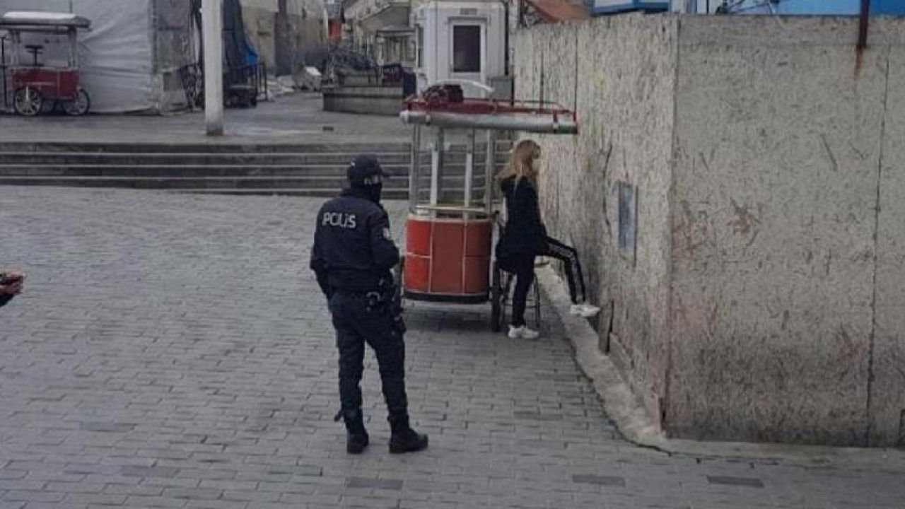 Taksi şoförü meydanda durduğu sırada araçtan inen kadın bu kez yaya olarak kaçmaya çalıştı. Polisin peşine düştüğünü gören kadın, boş bir simit arabasının arkasına saklandı. Ambulansa haber verilmesinin ardından polis, kadının kaçmasını engellemek etrafını sardı. Bu sırada kendini görüntüleyen basın mensuplarına tepki gösteren kadın, yerden bulduğu bir tahta parçasıyla yüzünü kapadı.