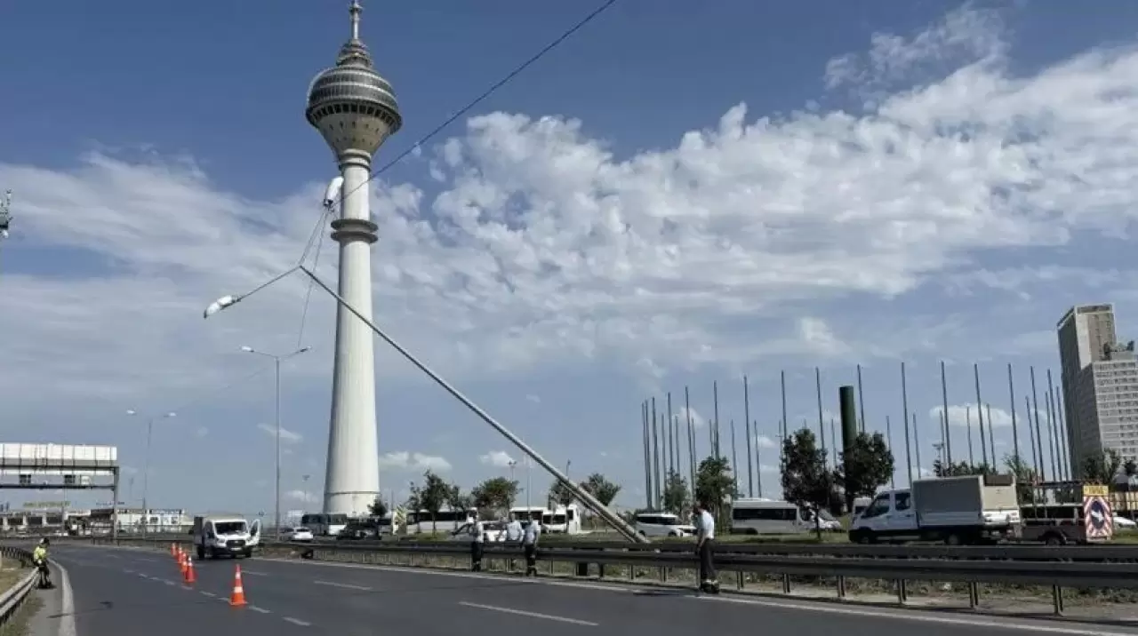 Edinilen bilgilere göre refüjde bulunan aydınlatma direklerinden biri şiddetli rüzgarda yan yattı.