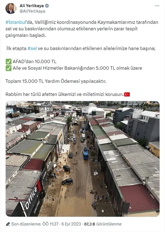 İçişleri Bakanı Ali Yerlikaya, İstanbul'da selden etkilenen vatandaşlara AFAD'dan 10.000 TL, Aile ve Sosyal Hizmetler Bakanlığından 5.000 TL olmak üzere toplam 15.000 TL yardım ödemesi yapılacağını açıkladı.