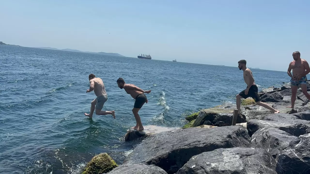 Sıcak havadan bunalan bazı vatandaşlar serinlemek için Fatih Sarayburnu Sahili'nde denize girerken, bazıları da sahil kenarında güneşlendi.