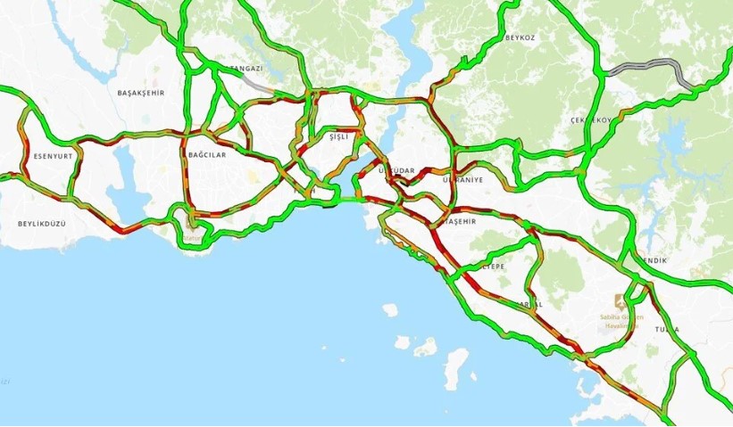 İBB trafik yoğunluk haritasına göre saat 08.45 itibariyle yoğunluk yüzde 75 olarak ölçüldü.