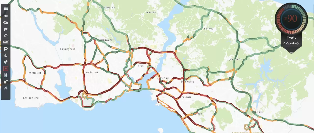 İstanbul Büyükşehir Belediyesinin CepTrafik uygulamasına göre, kent genelinde trafik yoğunluğu yüzde 90 seviyesine ulaştı.