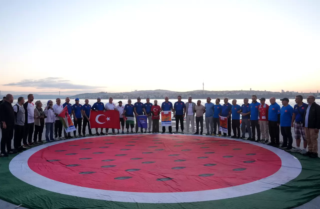 Gazze'ye destek mesajları veren yüzücüler adına açıklama yapan Yüksel Sönmez, her gün çocukların ve bebeklerin öldüğü Gazze'de insanlık dramına dikkati çekmek ve Küresel Sumud Filosu'na destek vermek için toplandıklarını söyledi.