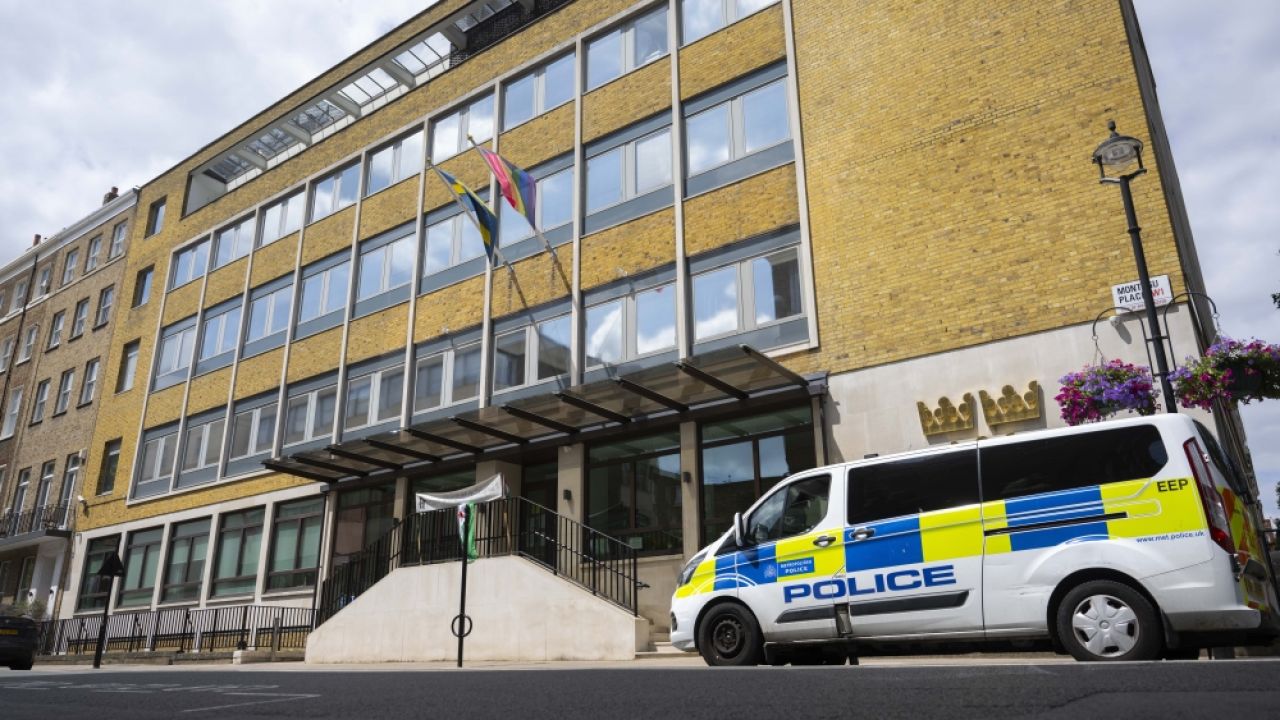 İngiliz polisi de göstericilerin eylemi sırasında büyükelçilik önünde güvenlik önlemleri aldı.