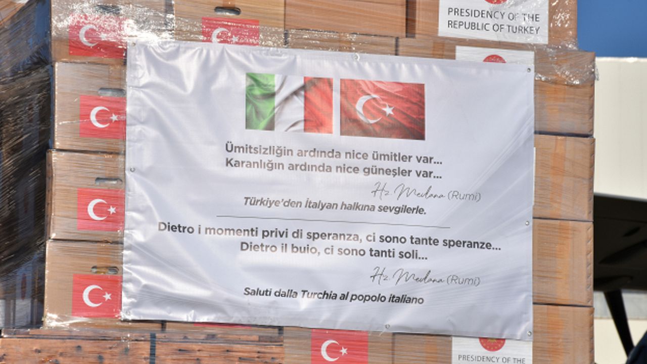 İtalya Büyükelçiliği, deprem bölgesine yapılan yardımları paylaştığı sosyal medya gönderisinde, Türkiye'nin COVID-19 pandemi döneminde İtalya'ya yolladığı yardım paketlerinin üzerindeki cümleyi kullandı: