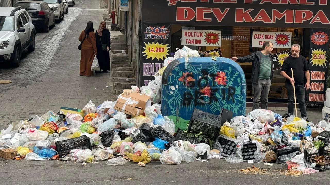 Biriken çöplerin kaldırımlara ve yola taştığı gözlendi. Esnaf Ali Çalışkan, grev nedeniyle 2 gündür çöplerin biriktiğini söyledi.