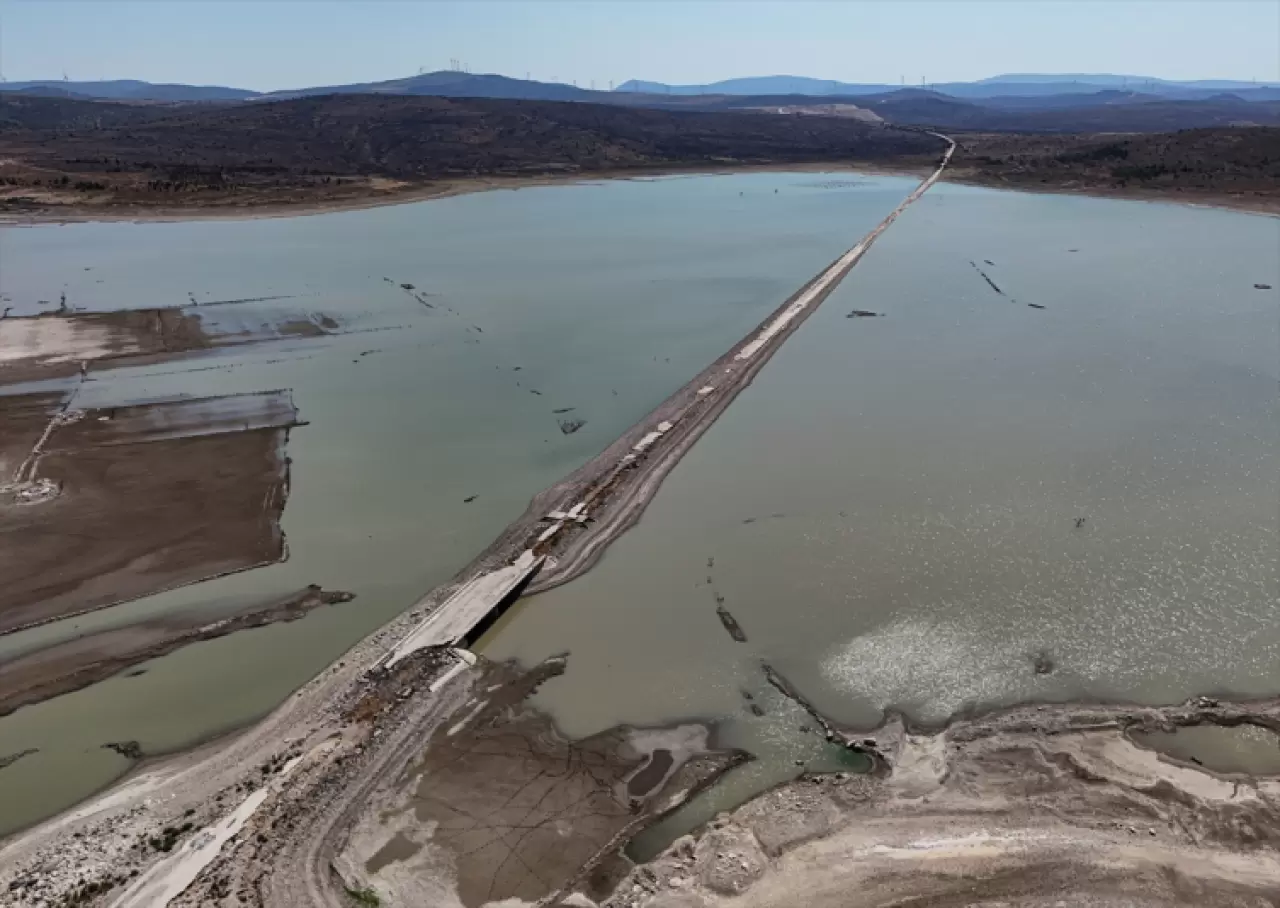 Barajda su seviyesinin düşmesiyle birlikte, baraj yapımından önce kullanılan eski İzmir-Çeşme kara yolu suların çekildiği alanda yeniden görünür hale geldi. Yürüyerek karşıya geçmenin mümkün olduğu yol, dronla görüntülendi.
