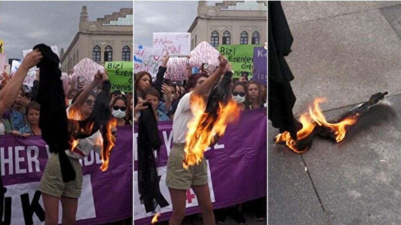 Eylemde bağırarak ‘özgürlükten’ bahseden kişiler başörtüsüne ve çarşafa saldırdı.