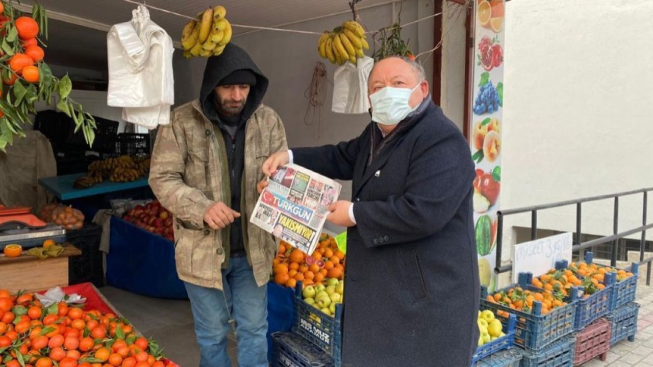 Başkan Tarhan, günlük 100 adet TÜRKGÜN gazetesini şehir merkezinde bulanan esnaflara dağıtımını yapıyor.