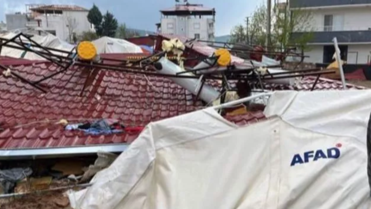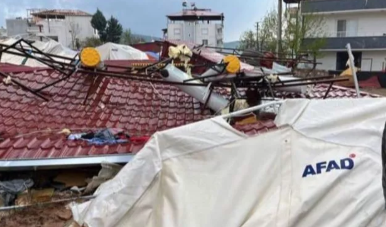 Pazarcık ilçesinde fırtına sonrası hortum meydana geldi. Hortumda hasarlı binaların çatısından kopan parçalar etrafa savruldu, depremzedelerin kaldığı çadırlar hava uçtu.
