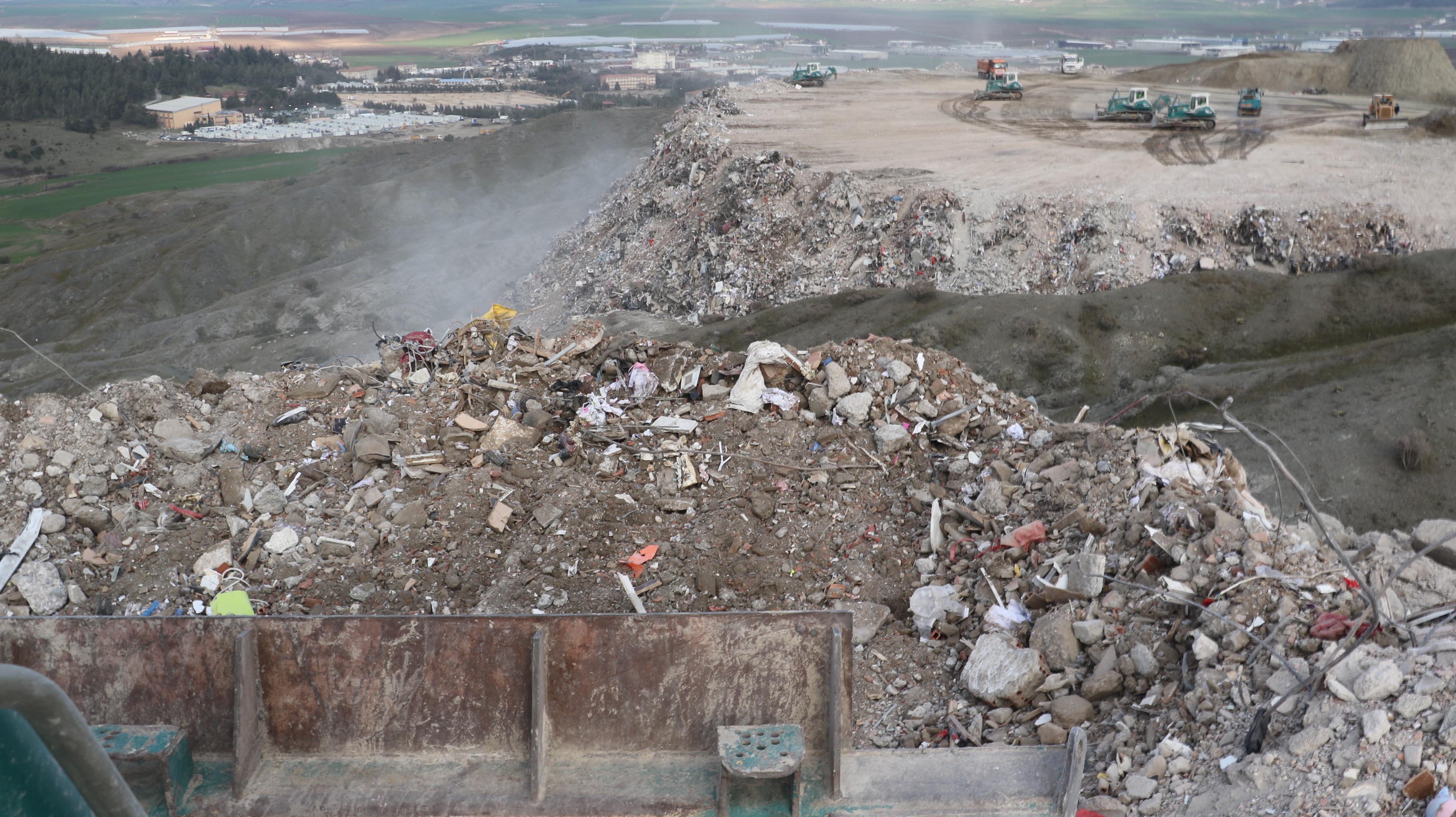 Kahramanmaraş'taki depremin ardından yerle bir olan binaların enkazı, döküm noktalarında adeta dağa dönüştü. Kamyonların bıraktığı hafriyatlar, iş makinelerince düzenlenip, döküm noktalarındaki tepelere yayılıyor.