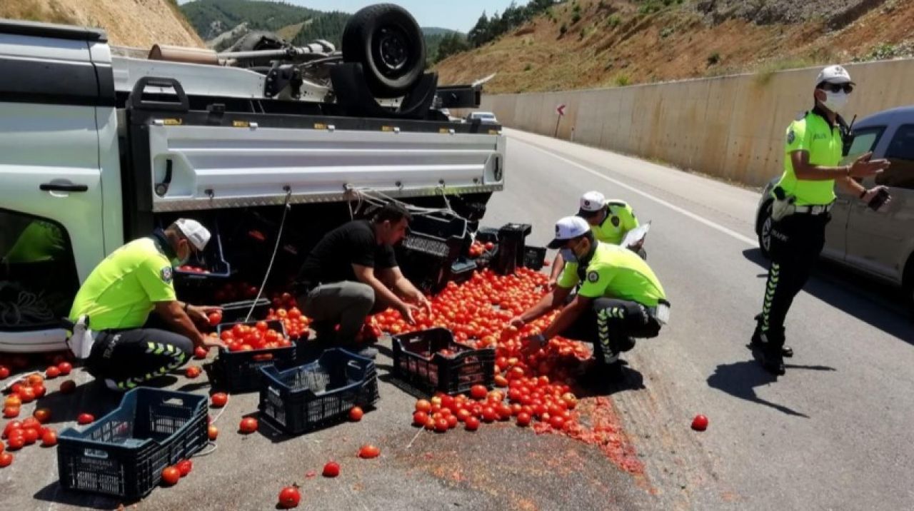 Devrilen kamyonetteki domatesler, yola saçıldı. Domatesler, trafik polisleri tarafından toplanarak, sağlam olanları yeniden kasalara konuldu.