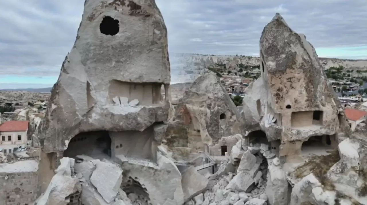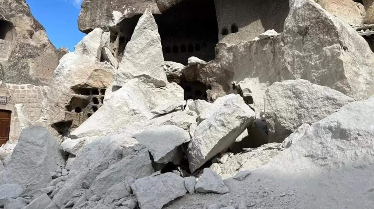 "Yıkılan peribacasının eteklerinde eski dönemlerde açılmış kaya mekanlar bulunuyor." diyen Aslanbay, iklim değişikliğinin yarattığı sıcaklık farklarına dikkat çekti.