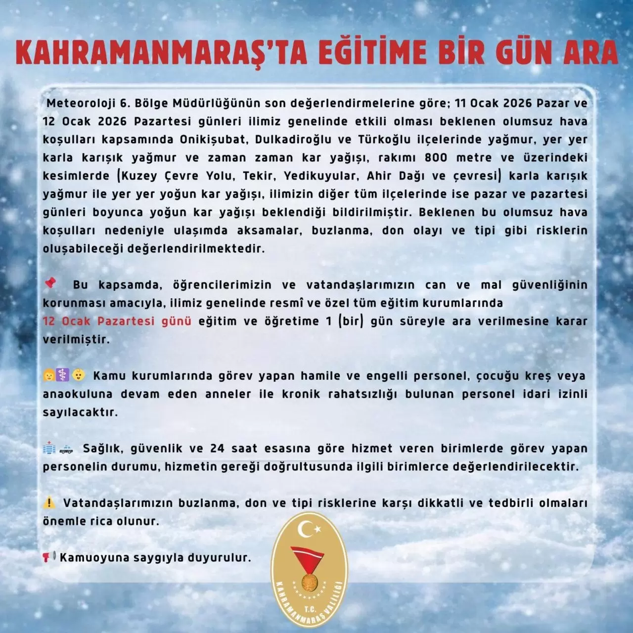 “İlimizin diğer tüm ilçelerinde ise pazar ve pazartesi günleri boyunca yoğun kar yağışı beklendiği bildirilmiştir. Beklenen bu olumsuz hava koşulları nedeniyle ulaşımda aksamalar, buzlanma, don olayı ve tipi gibi risklerin oluşabileceği değerlendirilmektedir. Bu kapsamda, öğrencilerimizin ve vatandaşlarımızın can ve mal güvenliğinin korunması amacıyla, ilimiz genelinde resmi ve özel tüm eğitim kurumlarında eğitim ve öğretime bir gün süreyle ara verilmesine karar verilmiştir. Kamu kurumlarında görev yapan hamile ve engelli personel, çocuğu kreş veya anaokuluna devam eden anneler ile kronik rahatsızlığı bulunan personel idari izinli sayılacaktır. Sağlık, güvenlik ve 24 saat esasına göre hizmet veren birimlerde görev yapan personelin durumu, hizmetin gereği doğrultusunda ilgili birimlerce değerlendirilecektir. Vatandaşlarımızın buzlanma, don ve tipi risklerine karşı dikkatli ve tedbirli olmaları önemle rica olunur.”