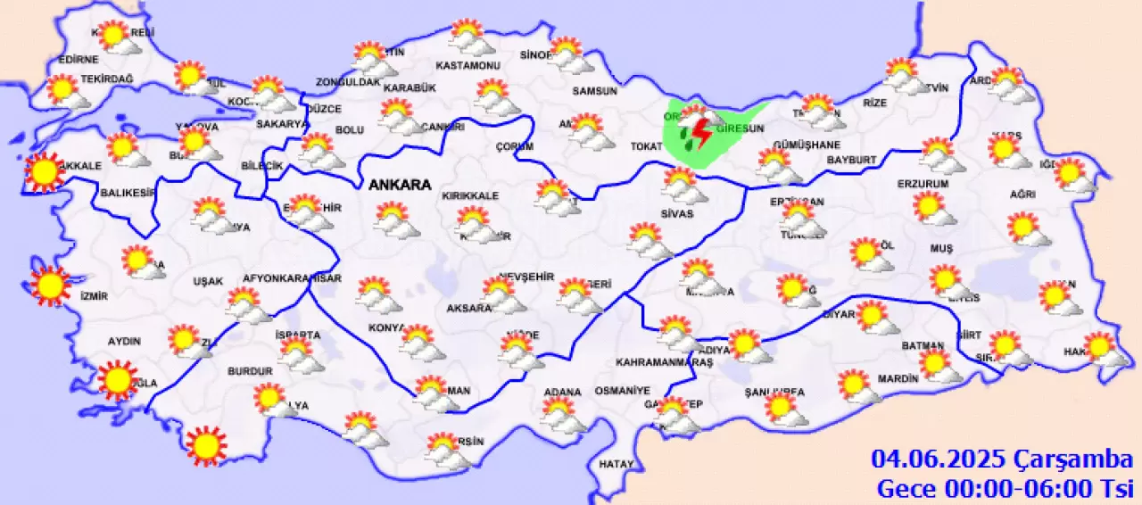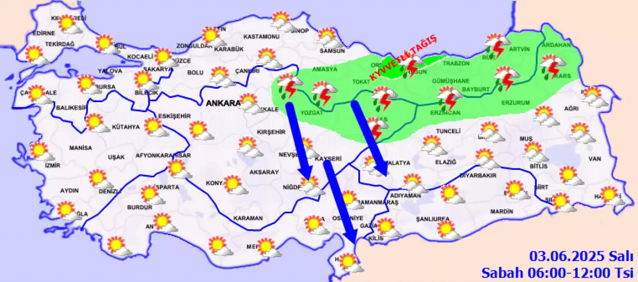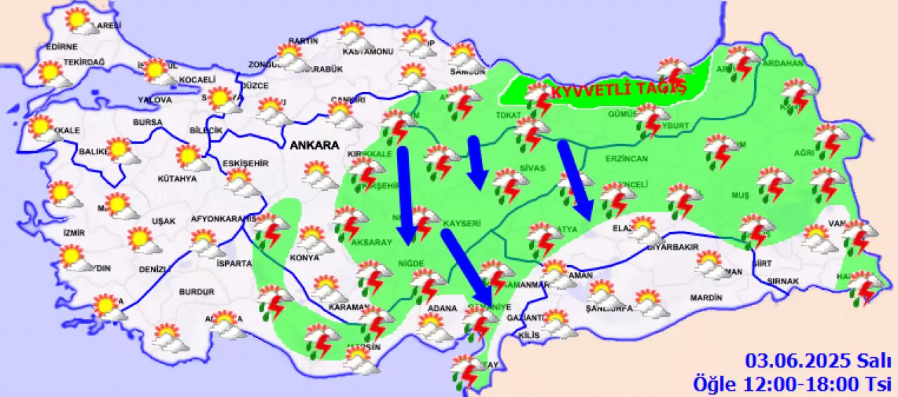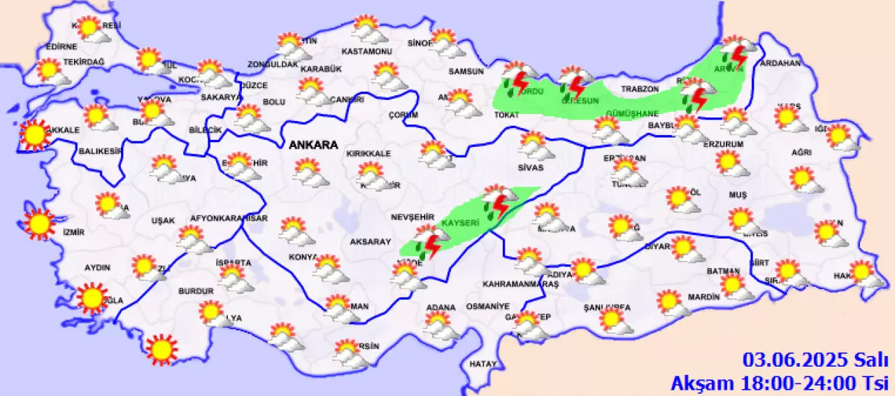 Meteoroloji Genel Müdürlüğü tarafından yapılan tahminlere göre: Ülkemizin iç ve doğu kesimlerinin parçalı yer yer çok bulutlu, Orta Akdeniz’in Toroslar Mevkii, Doğu Akdeniz’in kuzey ve doğusu, İç Anadolu'nun doğusu, Orta ve Doğu Karadeniz, Doğu Anadolu’nun kuzeyi ile Van'ın güney ve doğusu, Hatay'ın batısı, Konya'nın batısı, Malatya, Bitlis, Hakkari, Muş ve Bingöl çevrelerinin aralıklı sağanak ve gök gürültülü sağanak yağışlı, diğer yerlerin az bulutlu ve açık geçeceği tahmin ediliyor.