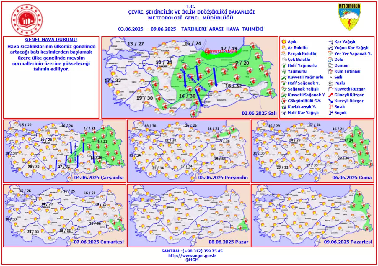 Meteoroloji Genel Müdürlüğü (MGM) tarafından yayımlanan haftalık hava durum raporuna göre yurt genelinde arefe gününden itibaren sıcaklıklar yükselmeye başlıyor. Kurban Bayramı'nda ise havanın bir hayli sıcak olduğu ve yağış beklenmediği görülüyor.