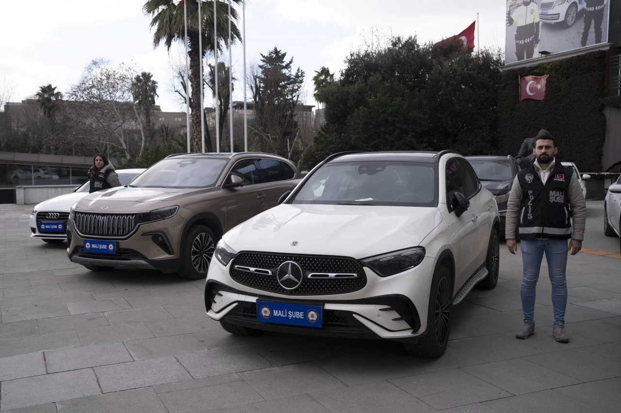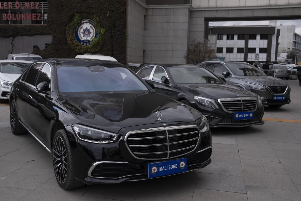 İstanbul merkezli 12 ilde gerçekleştirilen "nitelikli dolandırıcılık" ve "kara para" aklanmasına yönelik operasyonda ele geçirilen araçlar, İl Emniyet Müdürlüğü bahçesinde sergilendi.