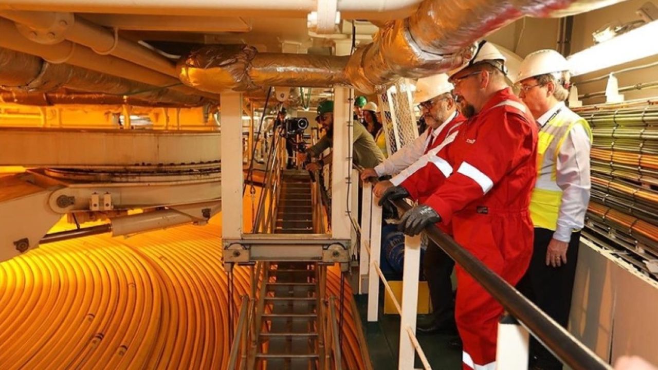 "Bunlardan birisi deniz tabanına yerleştirilecek olan ekipmanlar, diğeri karada yapılacak olan kara işleme tesisleri ve üçüncüsü de bunların arasındaki boru hatları... Bu boru hatları projesinin üçüncü bileşenini devreye sokmuş oluyoruz. Dolayısıyla aslında iki tane ana boru hattı, yardımcı boru hattı ve ana kontrol ünitesinin serilmesi işlemini tamamlayacak olan gemiyle çalışmalarımız tüm hızıyla başarılı şekilde devam ediyor.