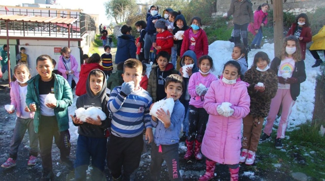 Okullarının bahçelerinde kar gören öğrencilerin mutlulukları gözlerinden okunurken, kartopu oynayan minik öğrenciler gönüllerince eğlendiler.