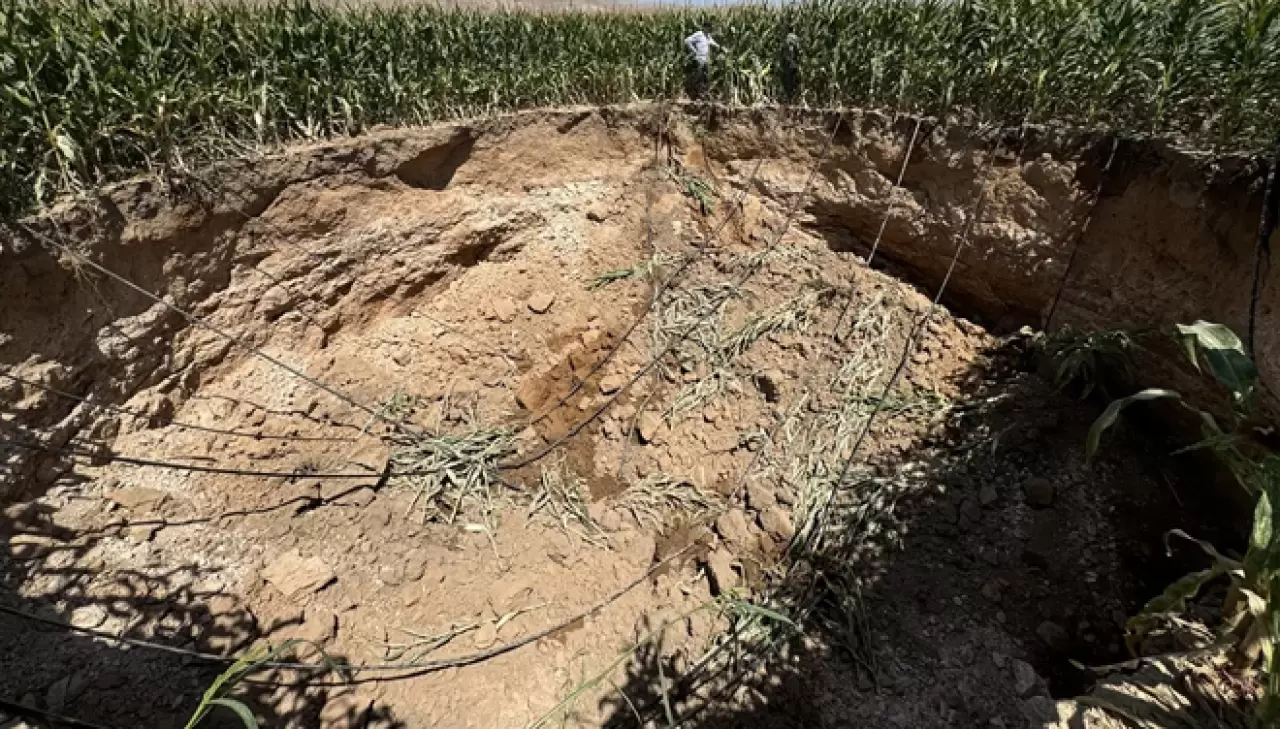 Tarlada sulama borularını toplayan çiftçiler, oluşan obruğu görünce durumu yetkililere bildirdi.
