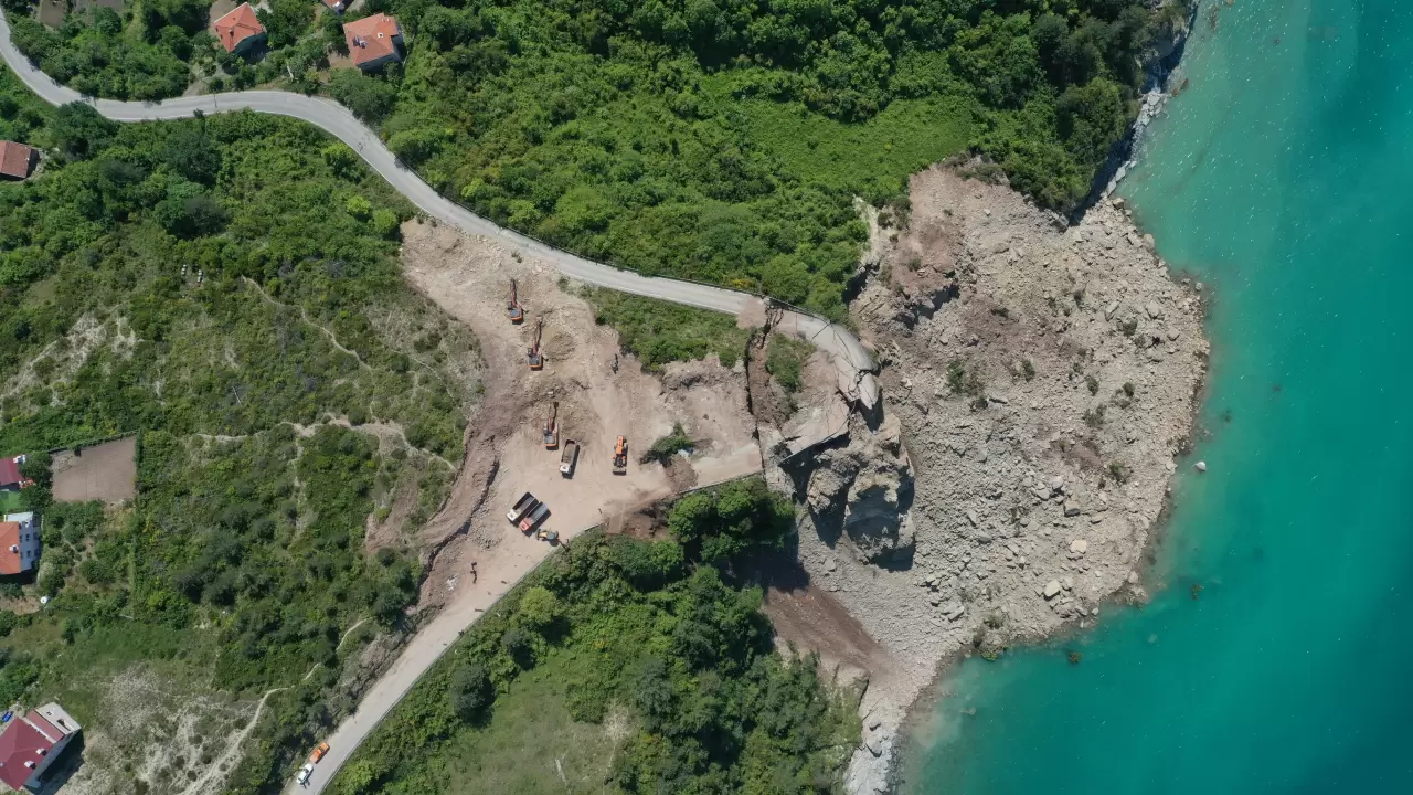 Heyelan nedeniyle kara yolunun denize doğru kayması dronla görüntülendi.