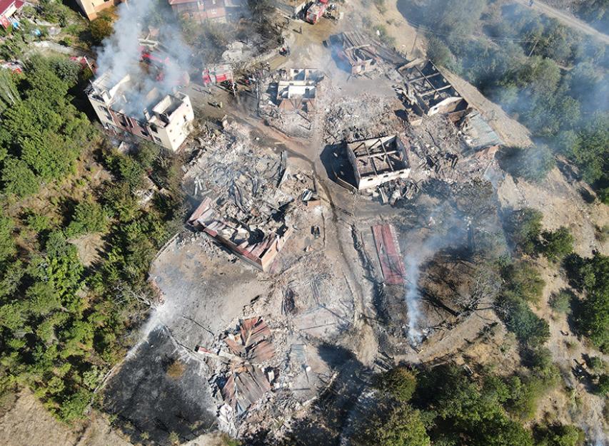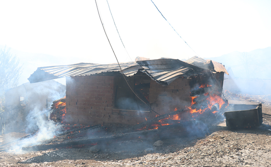 Rüzgarın etkisiyle kısa sürede büyüyen yangında 10 ev yandı.