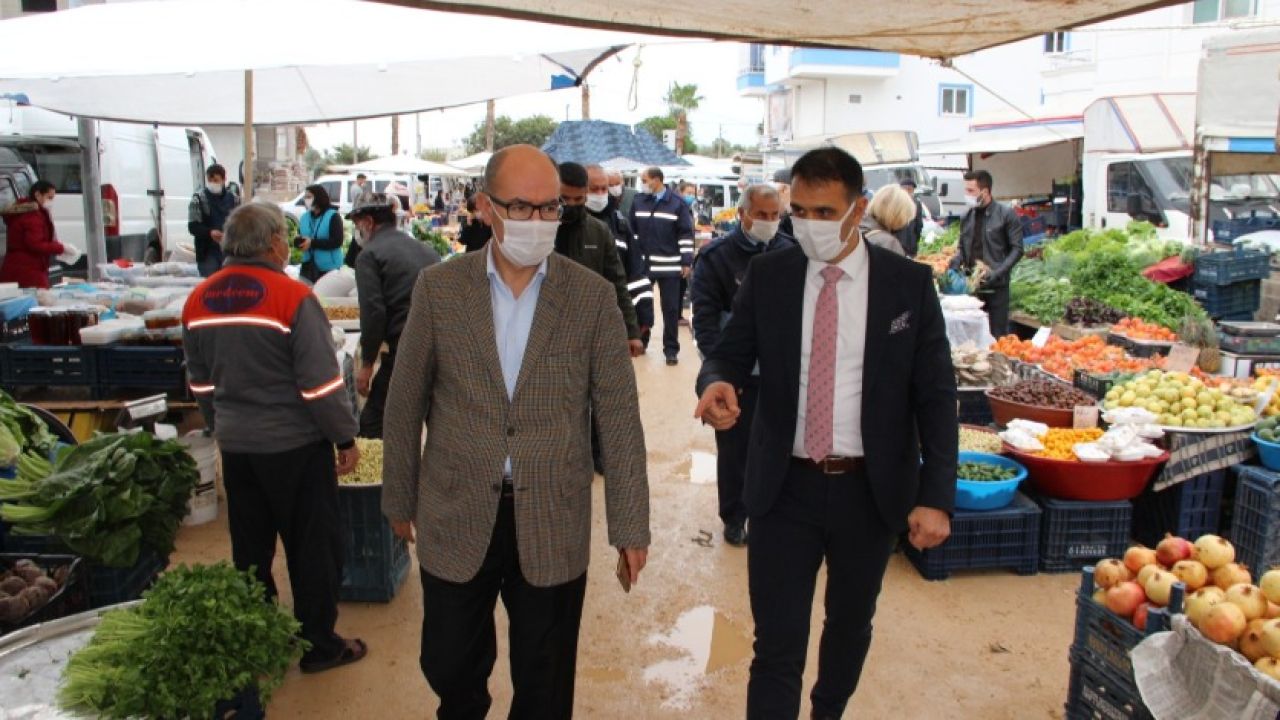 Taşucu mahallesinde kurulan semt pazarında pazarcı esnafı ve vatandaşlarla da sohbet eden Silifke Kaymakamı Namık Kemal Nazlı ve Belediye Başkanvekili Sadık Altunok, korona virüs tedbirlerinin önemine işaret ederek, kurallara riayet edilmesi gerektiğini vurguladılar.
