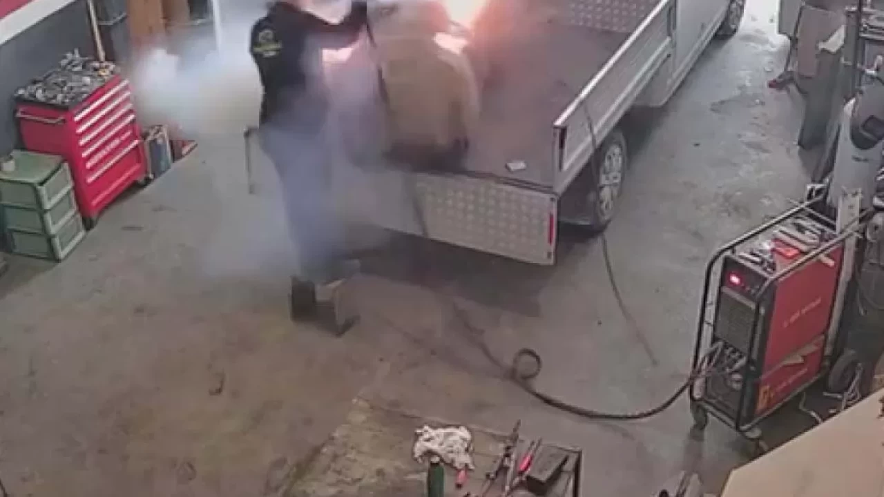 Olay, 9 Nisan'da saat 18.30 sıralarında kentteki sanayi sitesinde bulunan atölyede meydana geldi. Kaynak ustası, tamir için kamyonetle getirilen yakıt deposuna kaynak yapmaya başladı. Kaynak sırasında depoda aniden patlama meydana geldi. Patlamanın etkisiyle yere savrulan usta, yüzüne tuttuğu koruyucu maske sayesinde yara almadan kurtuldu. O anlar, iş yerinin güvenlik kamerasına yansıdı. Ortaya çıkan görüntülerde kaynak sırasında patlamanın yaşandığı anlar yer alıyor.