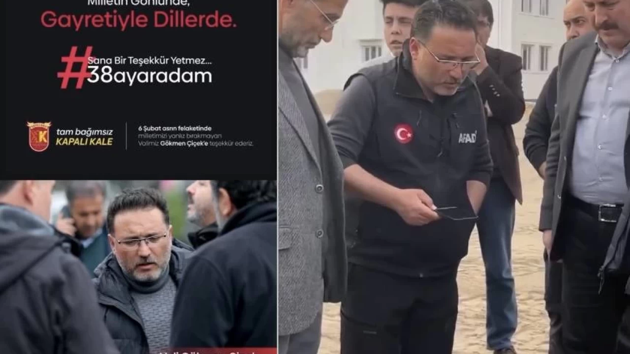 Kapalı Kale Derneği tarafından yapılan açıklamada, "Şimdi perde kalktı. O, milletin en zor anında yalnız bırakmayan, gece gündüz demeden sahada olan, yüreğini ortaya koyan bir adam: Valimiz Gökmen Çiçek. 6 Şubat 2023 Acının en derinden hissedildiği gün. O gün kimileri bekledi, kimileri izledi. Ama birisi vardı ki halkının yanından bir an bile ayrılmadı. Karanlığın içerisinde ışık oldu. Umudu ayakta tuttu. Bugün adı dualarda, emeği hafızalarda. Depremin bağrında halkın hep yanında duran #38AyarAdam’a sonsuz minnetle" denildi.