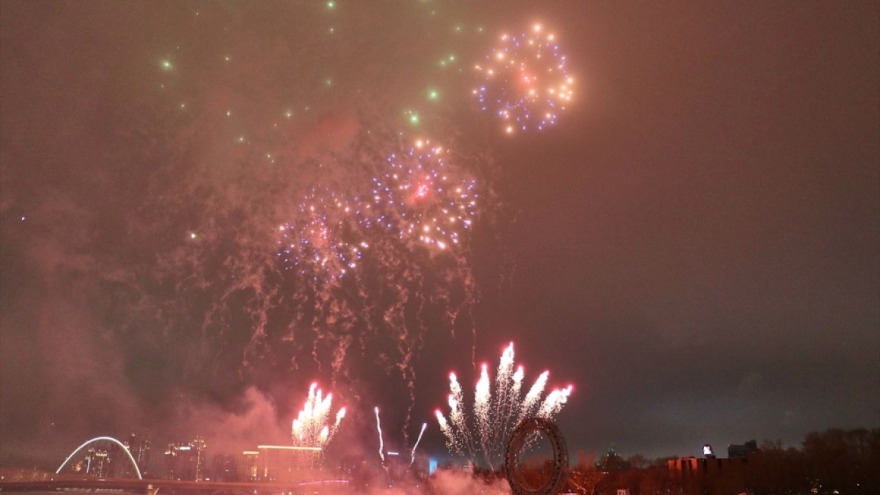 Astana sakinleri, havai fişek gösterilerini donmuş Yesil Nehri'nin kenarından izledi.