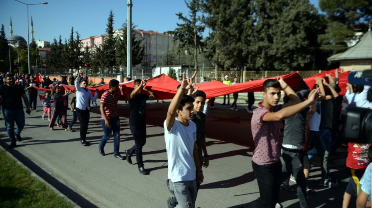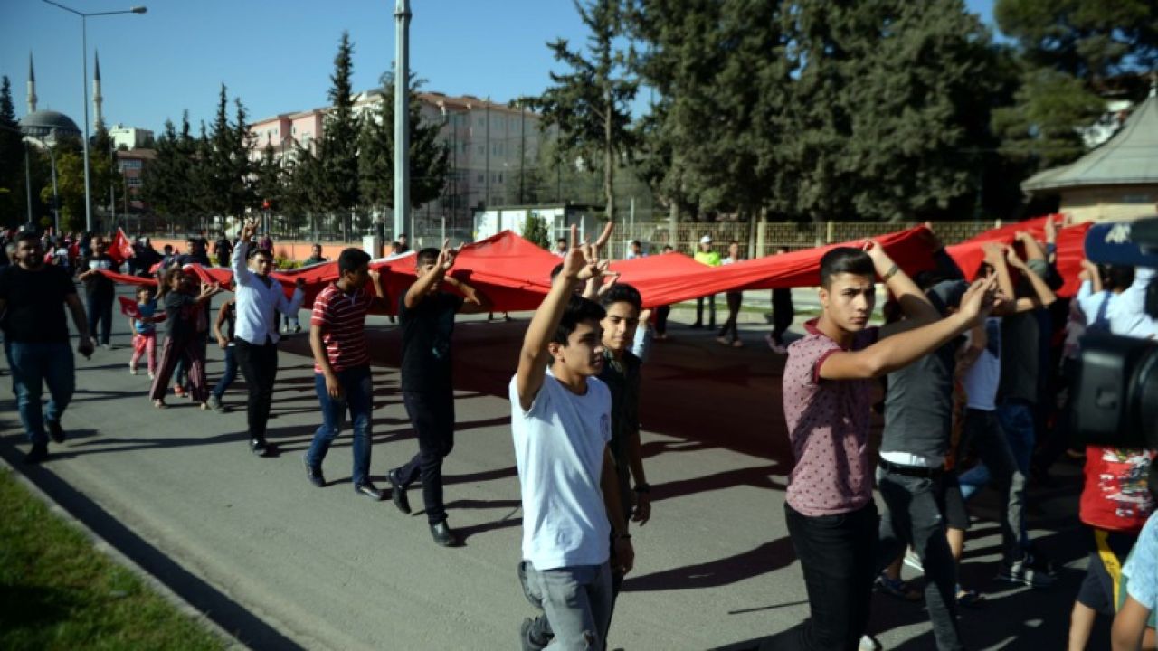 Türk bayrağı dağıtılan vatandaşlar, Cumhuriyet Meydanı'ndan Kilis Askerlik Şubesi önüne kadar yürüdü.
