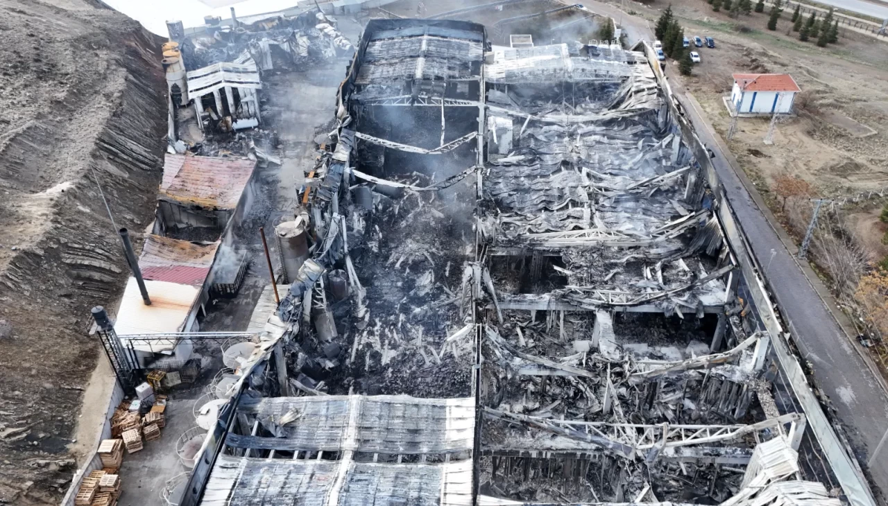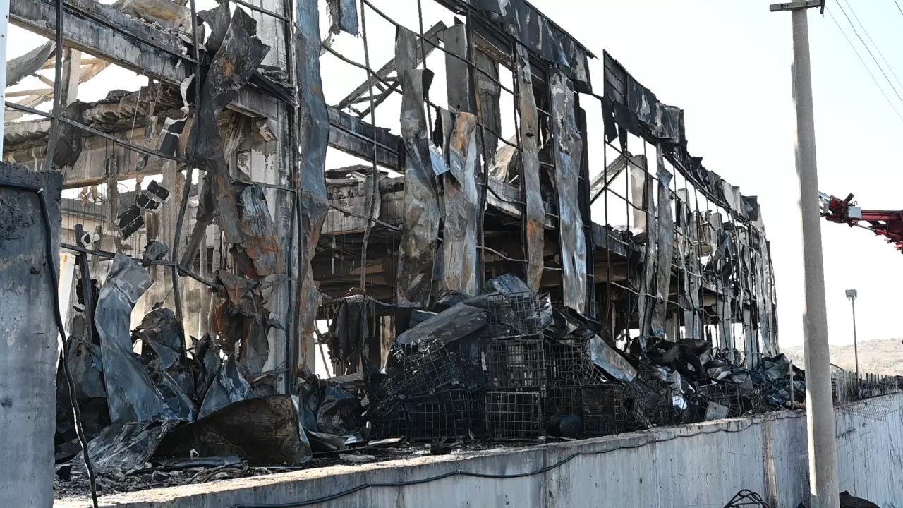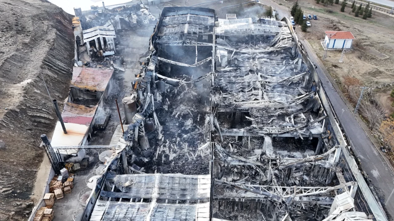 Yangının ardından enkaz yığını haline gelen fabrika havadan dronla görüntülenirken, soruşturma sürüyor.