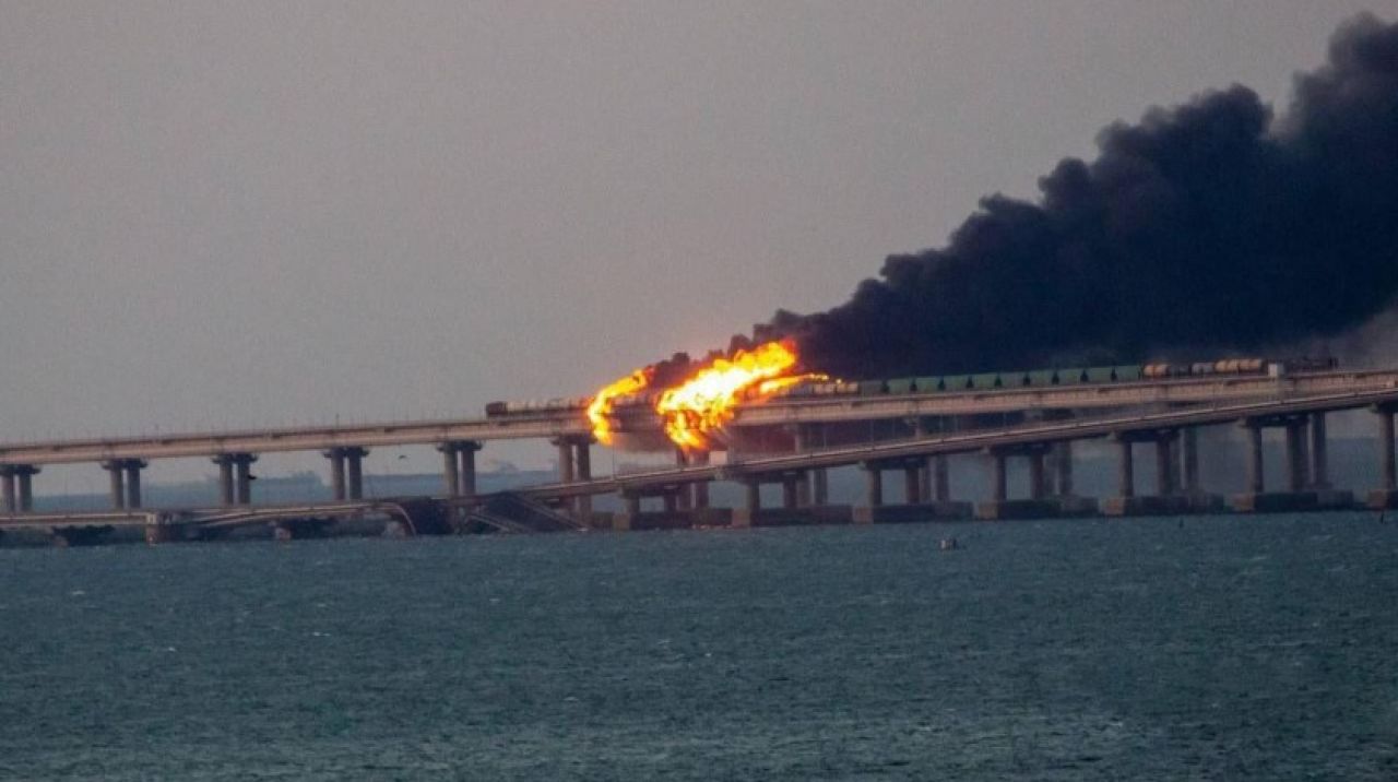 Sosyal medyada paylaşılan görüntülerde Kerç Köprüsü'ndeki yolun çökmesi, raylar üzerinde yakıt bulunan vagonlardan alevlerin yükselmesi yer alıyor.
