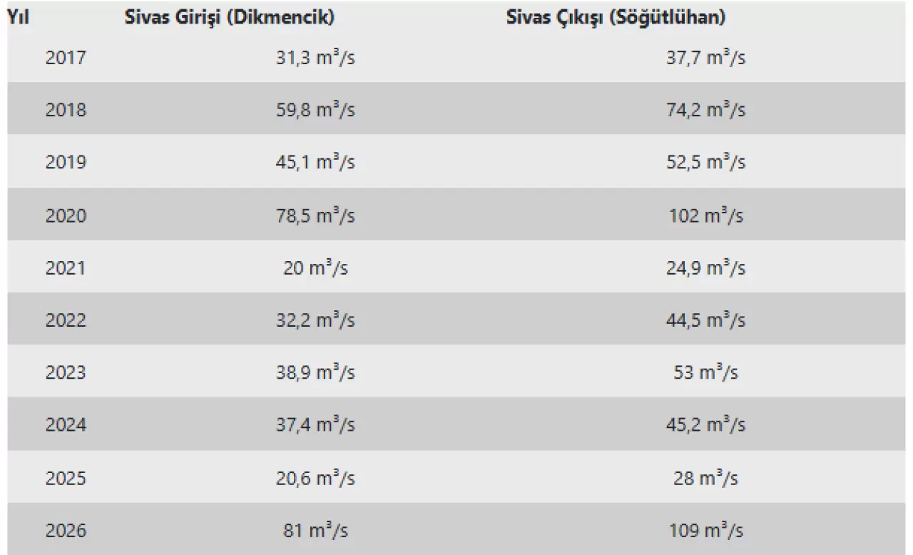 Irmağın Sivas çıkışındaki Söğütlühan mevkisinde geçen yıl saniyede 28 metreküp olarak tespit edilen ortalama debi, bu sene aynı dönemde saniyede 109 metreküp olarak ölçüldü.