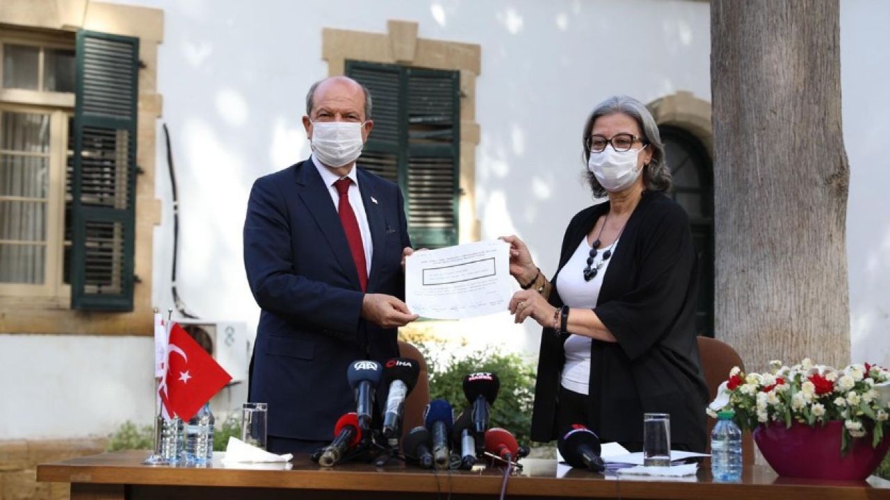 Başkent Lefkoşa'daki Yüksek Seçim Kurulu (YSK) yerleşkesinde yapılan törende, YSK Başkanı Narin Ferdi Şefik, dün yapılan cumhurbaşkanı seçiminin ikinci turunun ardından cumhurbaşkanı seçilen Tatar'a mazbatasını teslim etti.