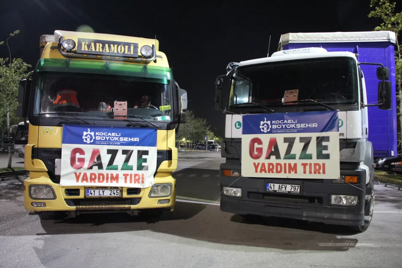Kocaeli Büyükşehir Belediyesi tarafından Gazze'ye gönderilmek üzere hazırlanan insani yardım tırları, düzenlenen törenin ardından dualarla yola çıktı.