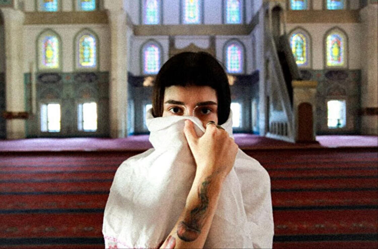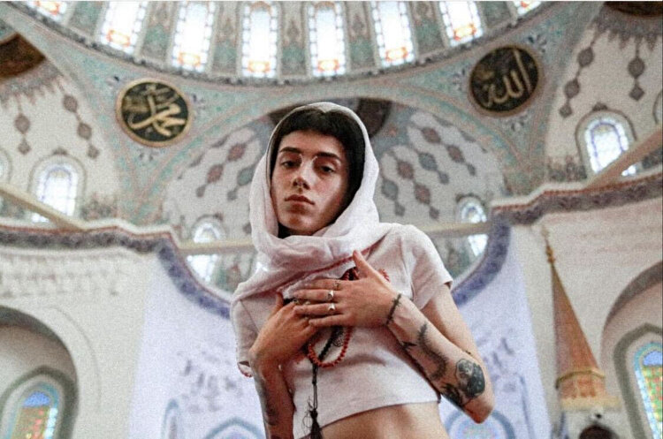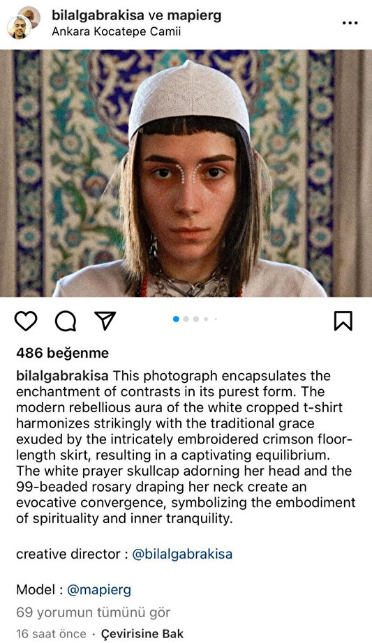 Camiye belini açıkta bırakan bir tişörtle giden modelin verdiği pozlarda eteğini yukarıya çektiği görüldü. Başörtüsü, takke ve tesbih ise aksesuar olarak kullanılarak dini değerler ayaklar altına alındı.